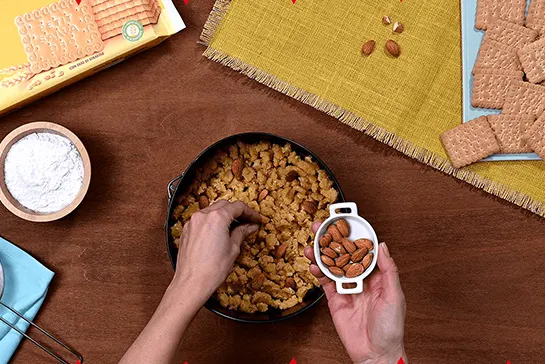 Unisci in una ciotola i biscotti tritati, la farina di mais, la farina di mandorle e il lievito. Alla fine mescola il tutto
