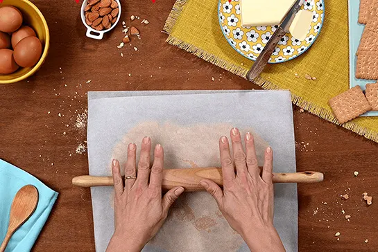 Stendi il composto con un mattarello (tra due fogli di carta forno) fino a raggiungere lo spessore di 1 cm. Alla fine metti in freezer per 1 ora
