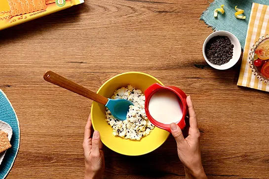 Prendi il mix di latte e gelatina e aggiungilo al composto con la ricotta precedentemente creato. Mescola tutto.
